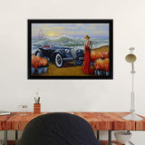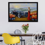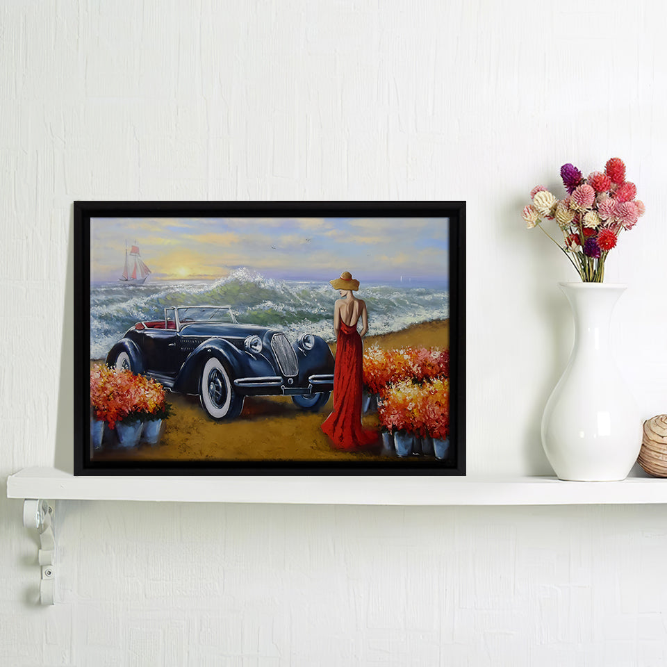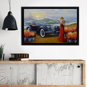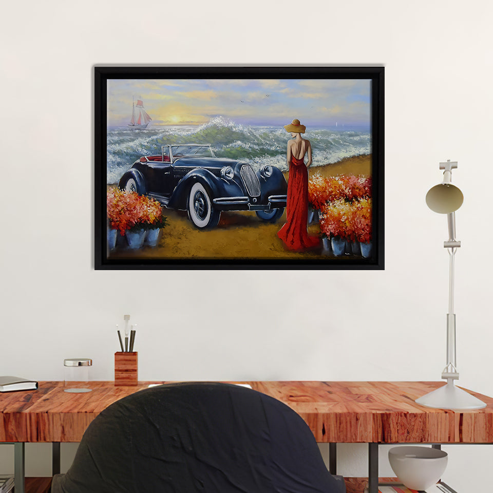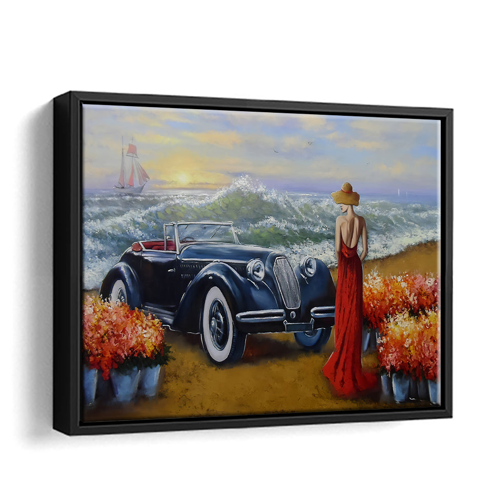 Car And Girl Painting Flowers Sea Ocean Romance Canvas Wall Art - Canvas Print, Framed Canvas, Painting Canvas
