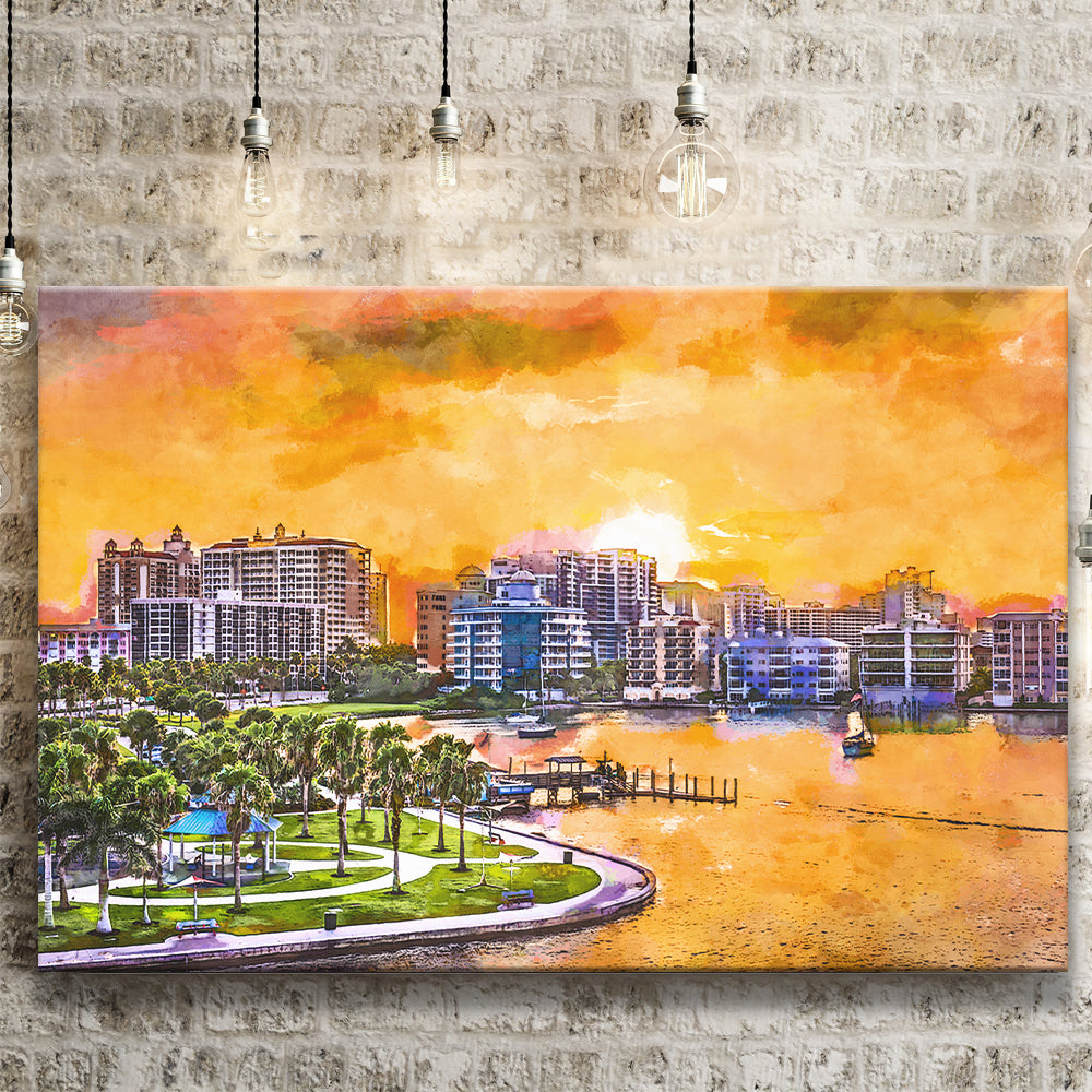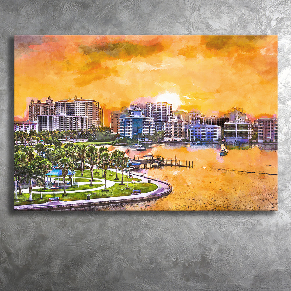 Sarasota Florida Usa Downtown Skyline On City Art Watercolor Canvas Prints Wall Art Home Decor, Large Canvas