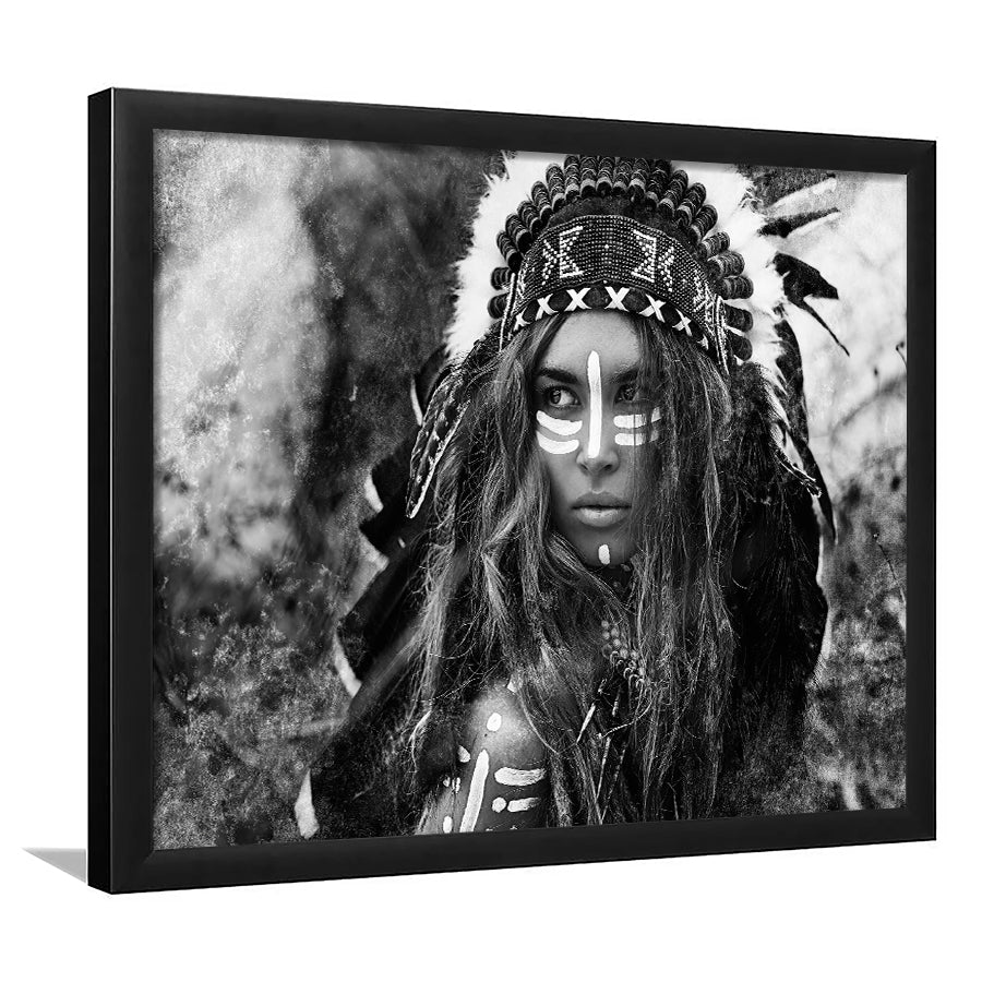 Warrior Girl With Feather Headdress Bw Framed Wall Art Print - Framed Art, Prints for Sale, Painting Art, Painting Prints